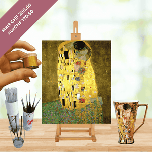 Entdecke unser exklusives Bundle mit dem Motiv "Der Kuss" von Gustav Klimt! Das Set beinhaltet das vorgedruckte Bild auf echtem Leinwand-Canvas, aufgerollte Leinwand, Farben, 3 Standard-Malpinsel, eine Tischstaffelei aus FSC-zertifiziertem Buchenholz und einen DIY Canva Rahmen. Verleihe deinem Gemälde mit der hochwertigen Gold Effekt Farbe eine künstlerische Note und setze feine Details mit dem Premium Fineliner Pinselset. Halte deine Pinsel ordentlich mit dem Edelstahl Pinselhalter. Genieße deinen Kaffee in der Klimt "Der Kuss" Kaffeetasse aus echtem Porzellan. Erwecke deine Kreativität und dekoriere deine Räume mit Stil!
